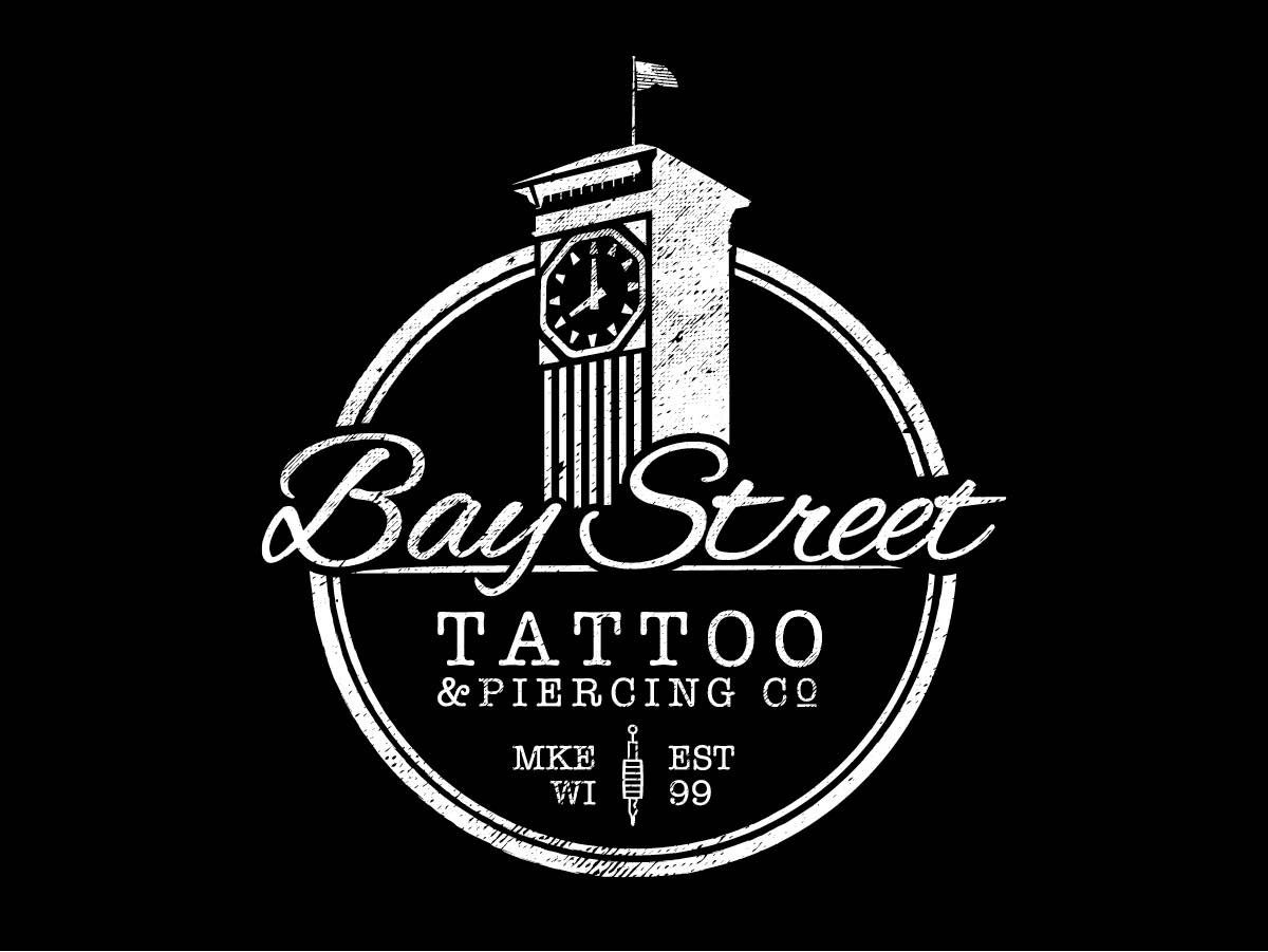 This logo was designed for Bay Street Tattoo and Piercing Co., located on Milwaukee’s Southside. An image of the Allen-Bradley clock tower is prominent, representing the shop’s location. The vintage/grunge texture was added, representing the 15+ years the shop has been in business and how tattoos and piercings are perceived. Lastly, the clock tower time reminds customers of the time the shop is (usually) open.